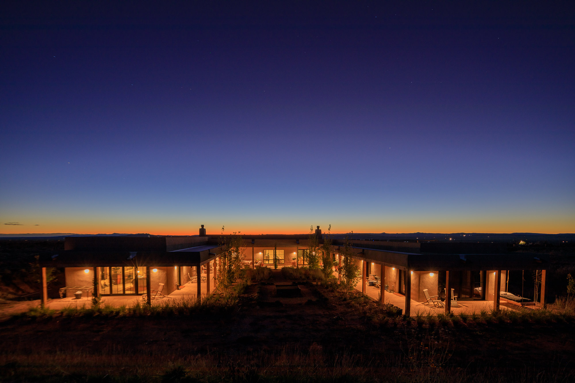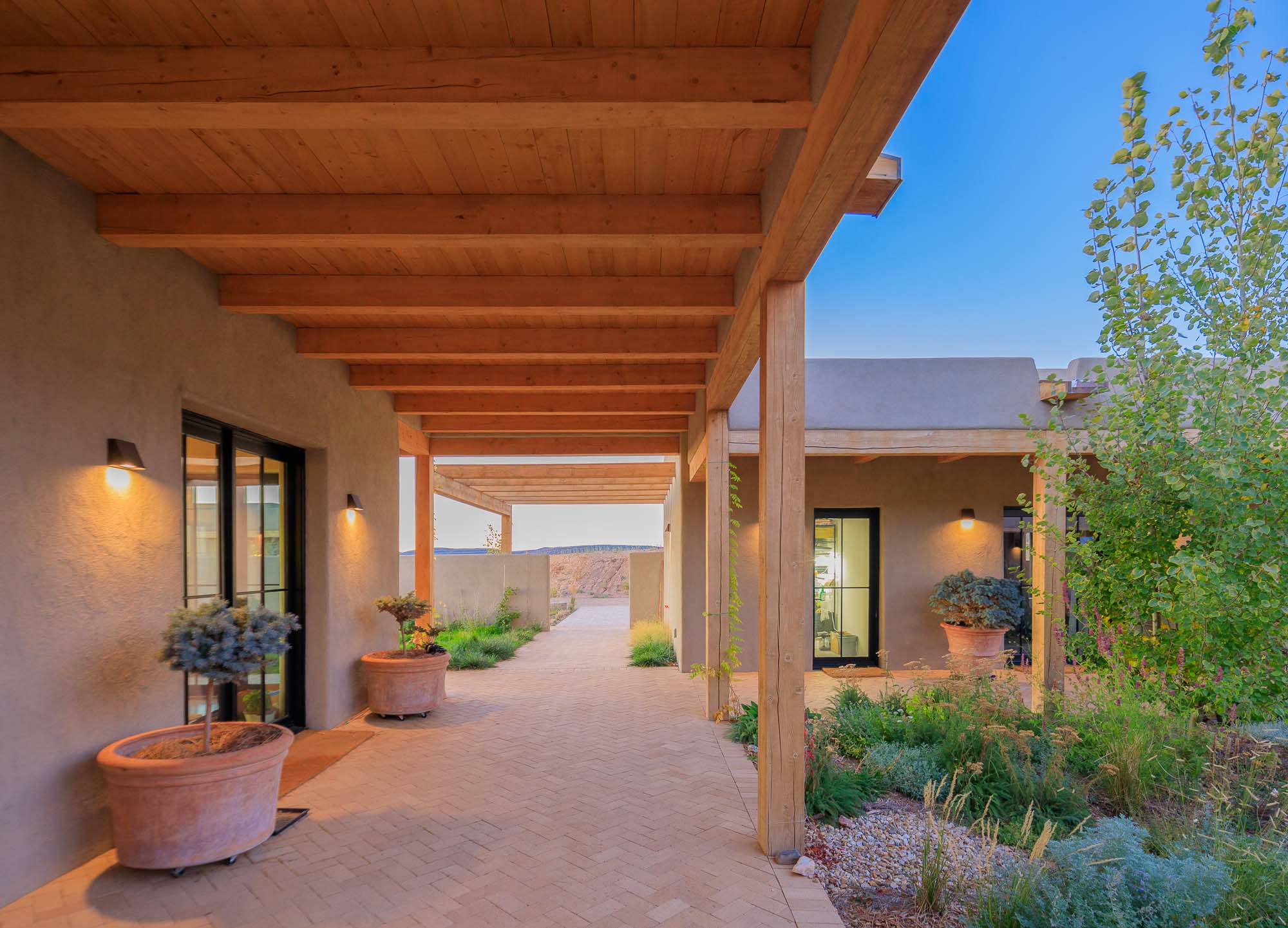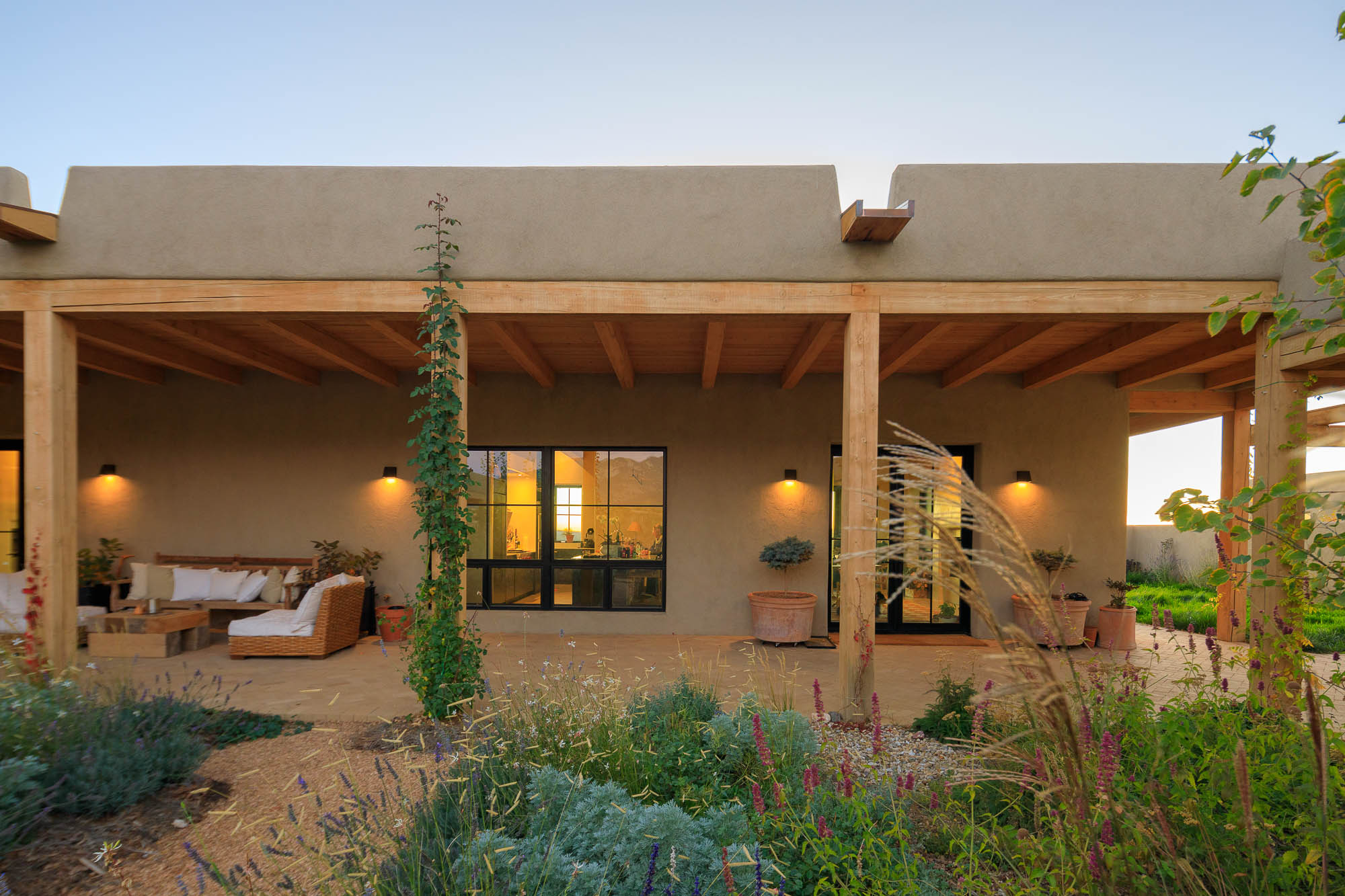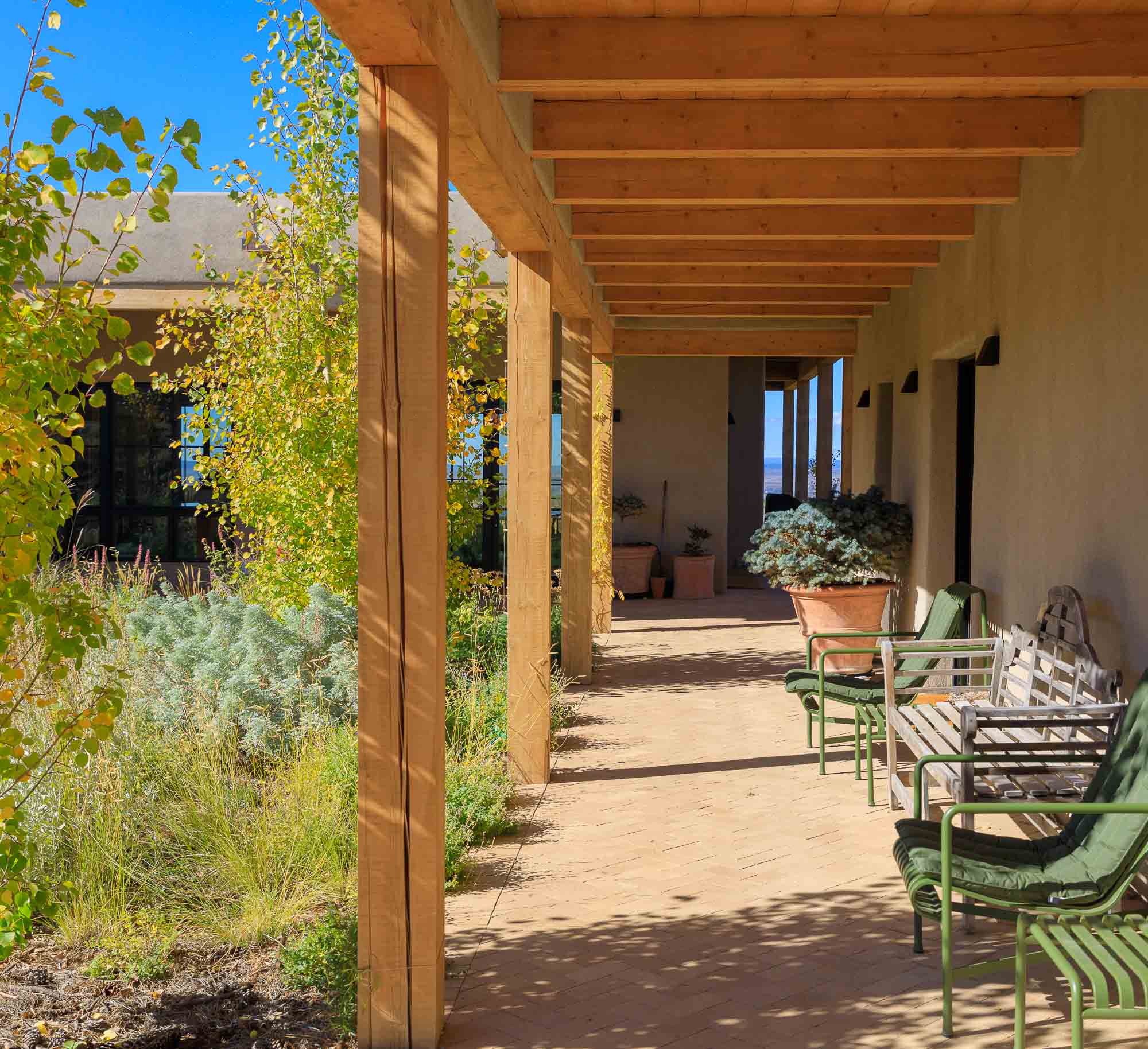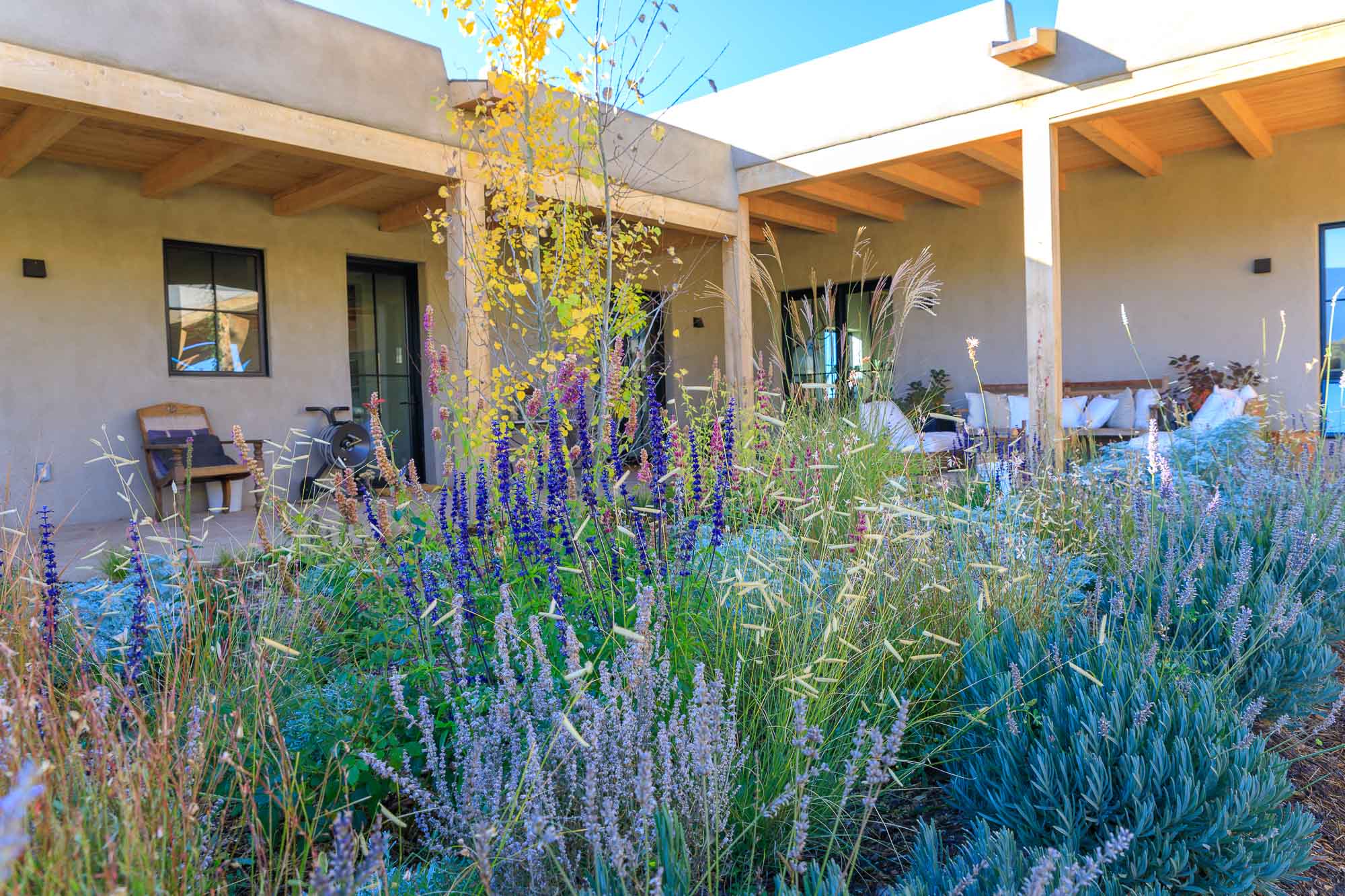 Nestled in the sage at the base of the Sangre De Cristos, The Courtyard is a sprawling home designed around a lavendar and aspen tree garden.